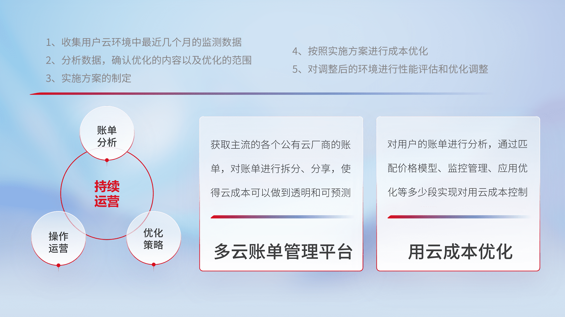 通过多云纳管,,以统一的资源数据模型把客户的云资源进行抽象和封装,,进而实现对多云资源的统一操作,,,,保障云资源管理的可靠性、、、稳定性与可用性。。。。量身定制化运维内容,,,配置、、、、开发运维、、补丁管理、、、、备份、、、监控、、、认证和访问管理、、审计和日常巡检等,,,保障在用云过程中的可靠度,,稳定度以及高可用率。。。。